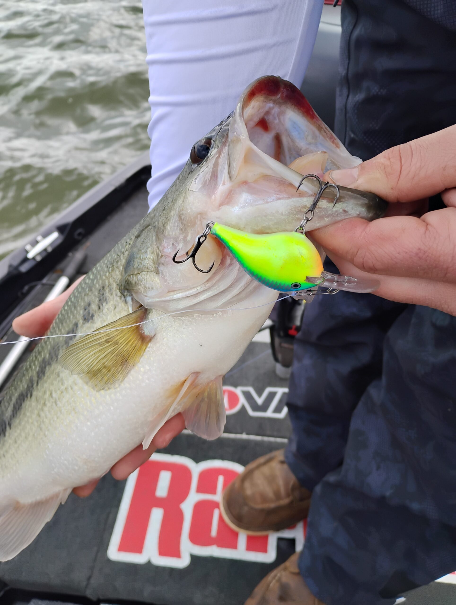 Jared and I fished woods today from 8am until 2:30 and the ones you see below was our best. Rapala DT6 Cribbean Shad and Chartreuse Rootbeer did most of the damage. www.rapala.com Water temp on the ramp side of the bridge ranges from 52 to 54 but under the bridge it begins to drop quickly. All our fish came from water no deeper than 5-6 feet.